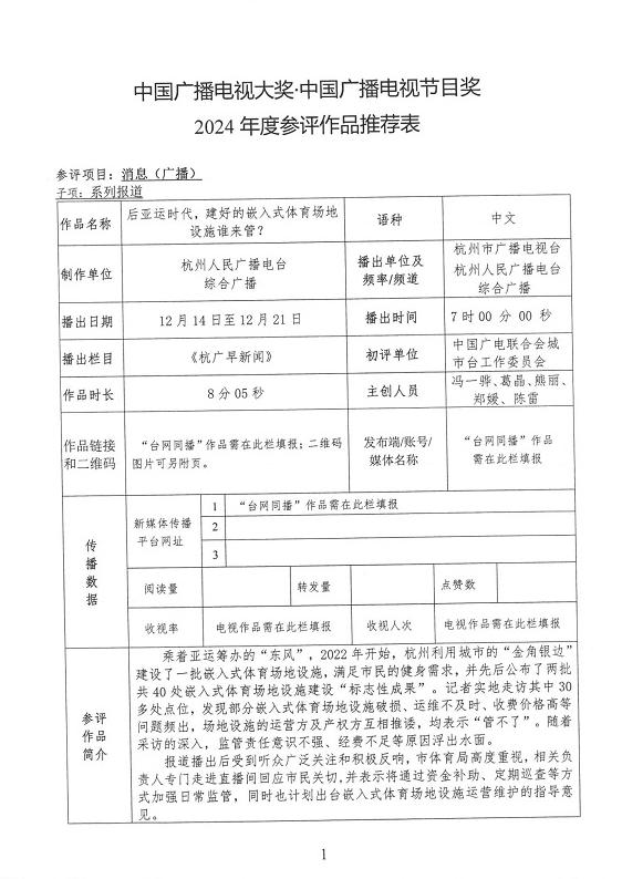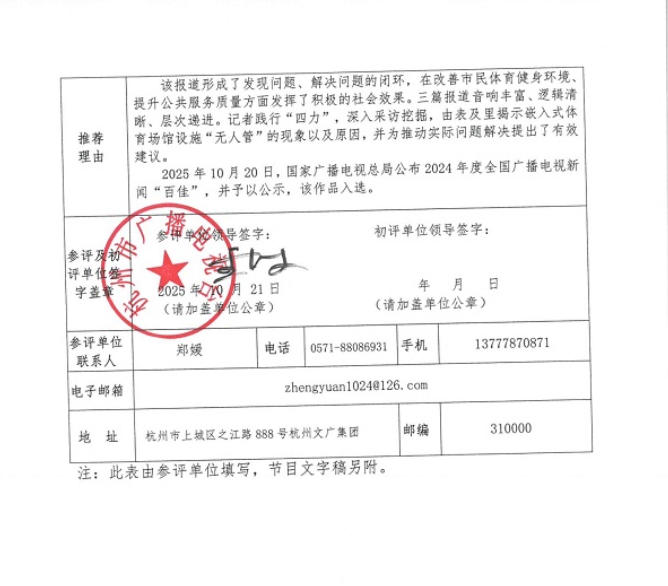 根據(jù)相關(guān)評(píng)獎(jiǎng)要求,我單位擬推薦杭州人民廣播電臺(tái)的廣播消息(系列報(bào)道)《后亞運(yùn)時(shí)代,建好的嵌入式體育場(chǎng)地設(shè)施誰(shuí)來(lái)管?》和南京廣播電視臺(tái)的廣播專題《“零碳鄉(xiāng)村”不等于“窮村”!》參加第四屆中國(guó)廣播電視大獎(jiǎng)?中國(guó)廣播電視節(jié)目獎(jiǎng)(2024年度)復(fù)評(píng),現(xiàn)予公示。公示期:2025年10月22日至2025年10月28日。如有異議,請(qǐng)與委員會(huì)秘書處聯(lián)系。聯(lián)系電話:025-84561700、18652075407,聯(lián)系郵箱:cstgbxw@163.com。